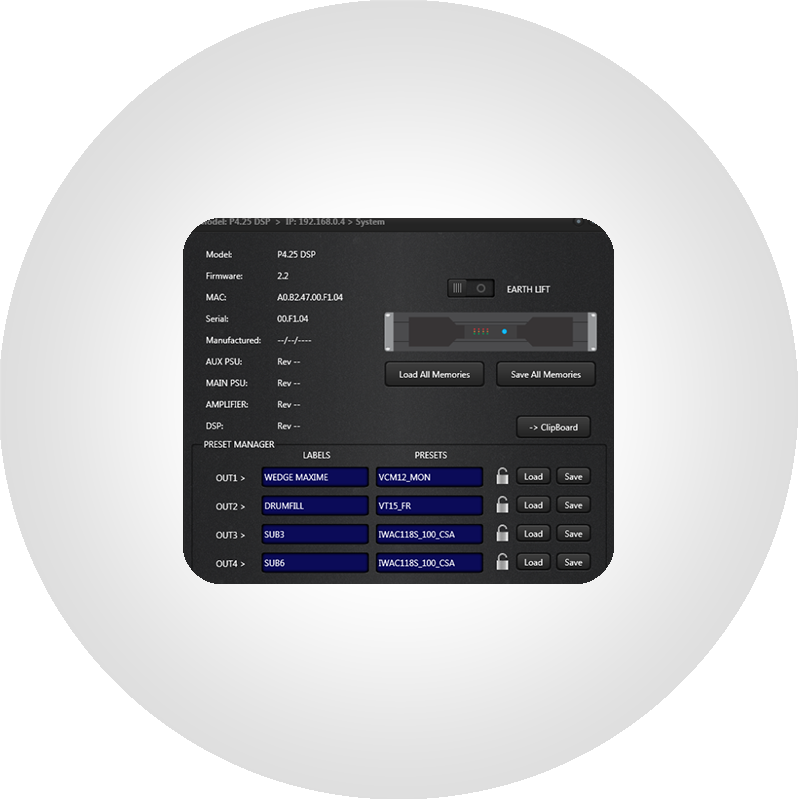 Take FULL control of all your amplifiers with a single software. You can remotely do anything. Power on or off, earthlift or not, recall and store preset, memories or scenes.